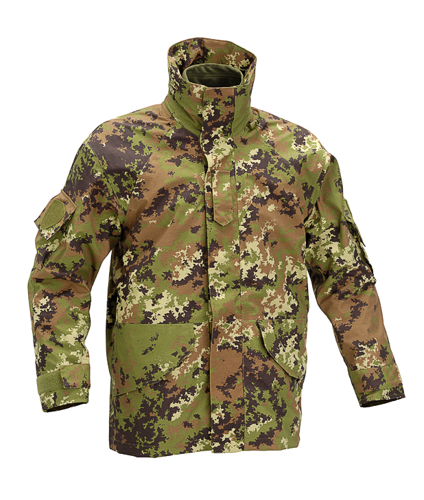 Costruita con 3 strati di POLIAMMIDE con trattamento esterno in PTFE, che lo rendono idrorepellente, antivento e traspirante, il parka ha una manifattura semirigida con cuciture sigillate da nastro HS, polsini regolabili, due cappucci di protezione, di cui uno fisso per la protezione del capo ed uno amovibile con visiera e regolazione per l’utilizzo sopra caschetto o elmetto. La giacca viene fornita con pile interno rimovibile da cerniere che, una volta staccato, diventa una giacca utilizzabile separatamente. Il pile è da 450 gr/mq circa, ha polsini elastici, 2 tasche richiudibili a cerniera sui fianchi e velcro per il posizionamento di scudetto, grado, nome, arma di appartenenza