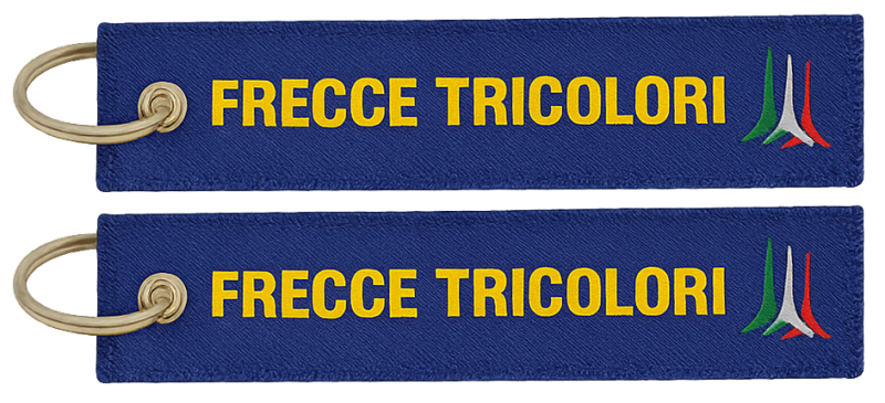 Portachiavi in tessuto blu ricamato con scritta gialla “FRECCE TRICOLORI” e logo stilizzato della pattuglia acrobatica nazionale con i colori della bandiera italiana.
