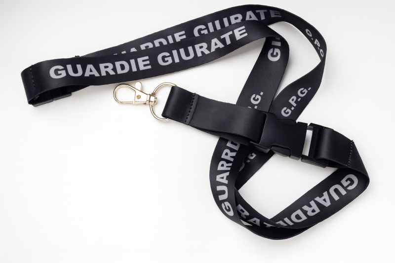 La banda è personalizzata con la scritta “GUARDIE GIURATE” in colore grigio chiaro/argento, ben leggibile anche a distanza. A intervalli regolari compare anche l’abbreviazione “G.P.G.” (Guardia Particolare Giurata). La stampa è uniforme, resistente e progettata per non scolorire facilmente con l’uso quotidiano.
