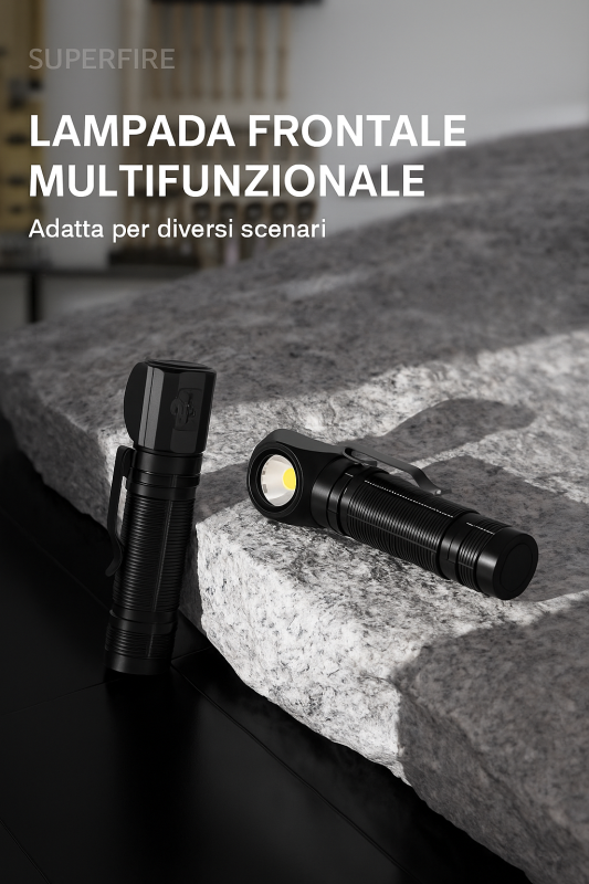 Questa torcia multifunzionale combina la praticità di una lampada frontale con l’efficienza di una torcia, offrendoti un’esperienza di illuminazione a mani libere senza precedenti.