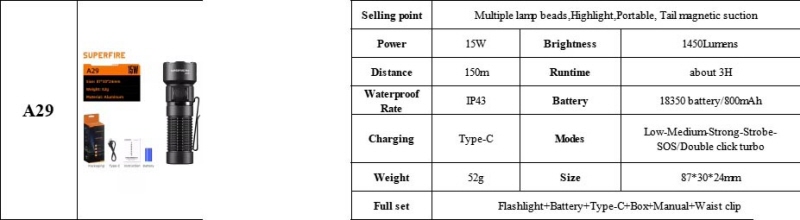 La SUPERFIRE A29 è una torcia EDC ultracompatta progettata per garantire prestazioni elevate in qualsiasi situazione. Con un peso di soli 52 g, offre un’illuminazione potente grazie ai tre LED SH-U03 “white laser” e alla lente ad alta luminosità che genera un fascio ampio, penetrante e uniforme.