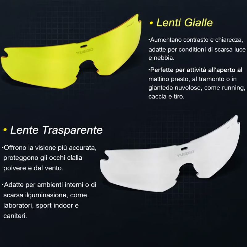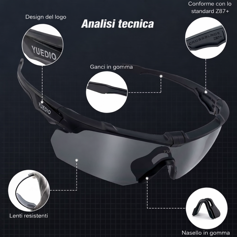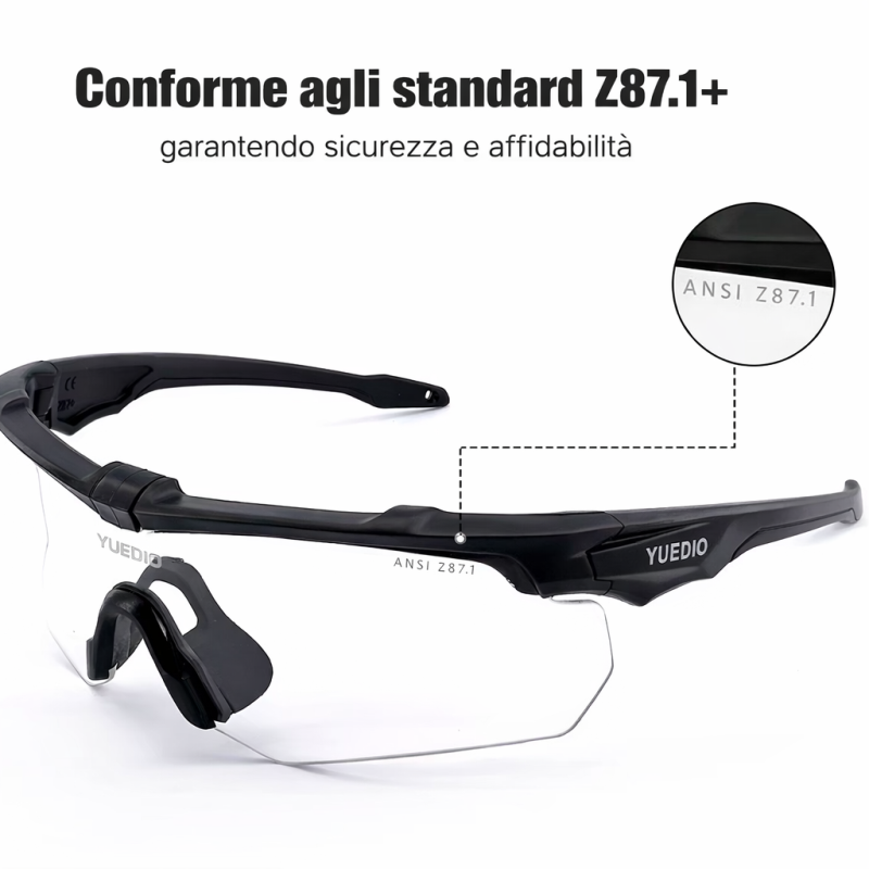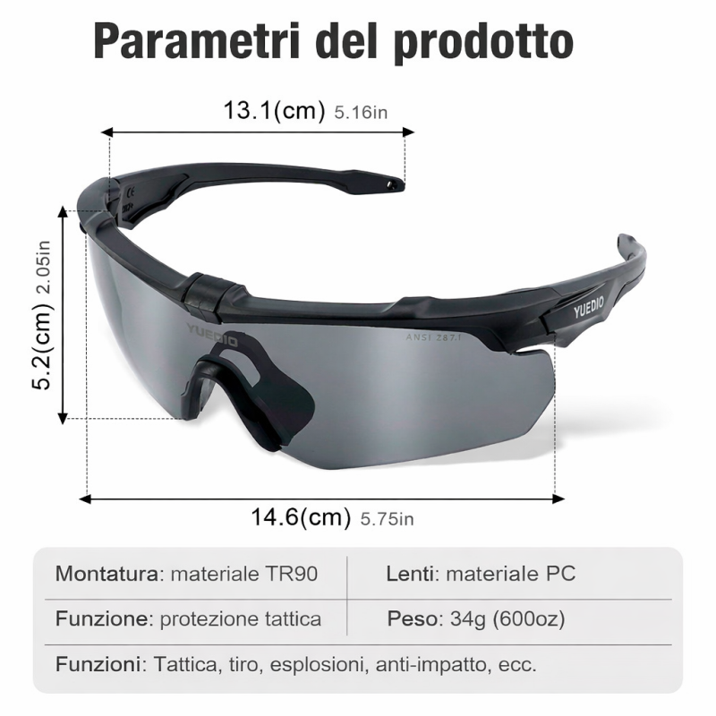 Gli occhiali tattici YUEDIO sono realizzati per garantire sicurezza certificata, resistenza agli urti e comfort prolungato, ideali per tiro sportivo, outdoor, lavoro operativo e utilizzo professionale.